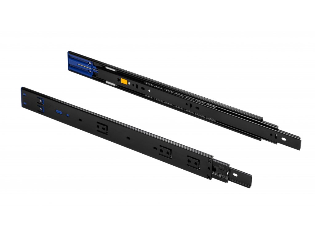 Černý pojezd Versalite Plus 300 mm s tlumením – stylový a tichý plnovýsuv s nosností 40 kg. Skvělý pro moderní zásuvky v kuchyni i obýváku.
