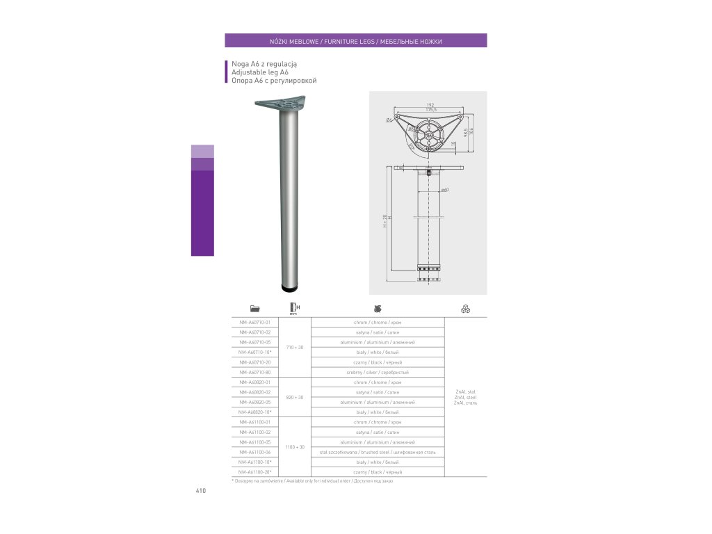 Noha ke stolu GTV A60 s průměrem ⌀60 mm a výškou 710 mm je určena pro stoly, pracovní desky a další nábytkové konstrukce. Pevná konstrukce zajišťuje stabilní oporu a nastavitelná patka umožňuje přesné vyrovnání drobných nerovností podlahy. Hliníkové provedení je lehké, odolné a vhodné pro moderní interiéry.